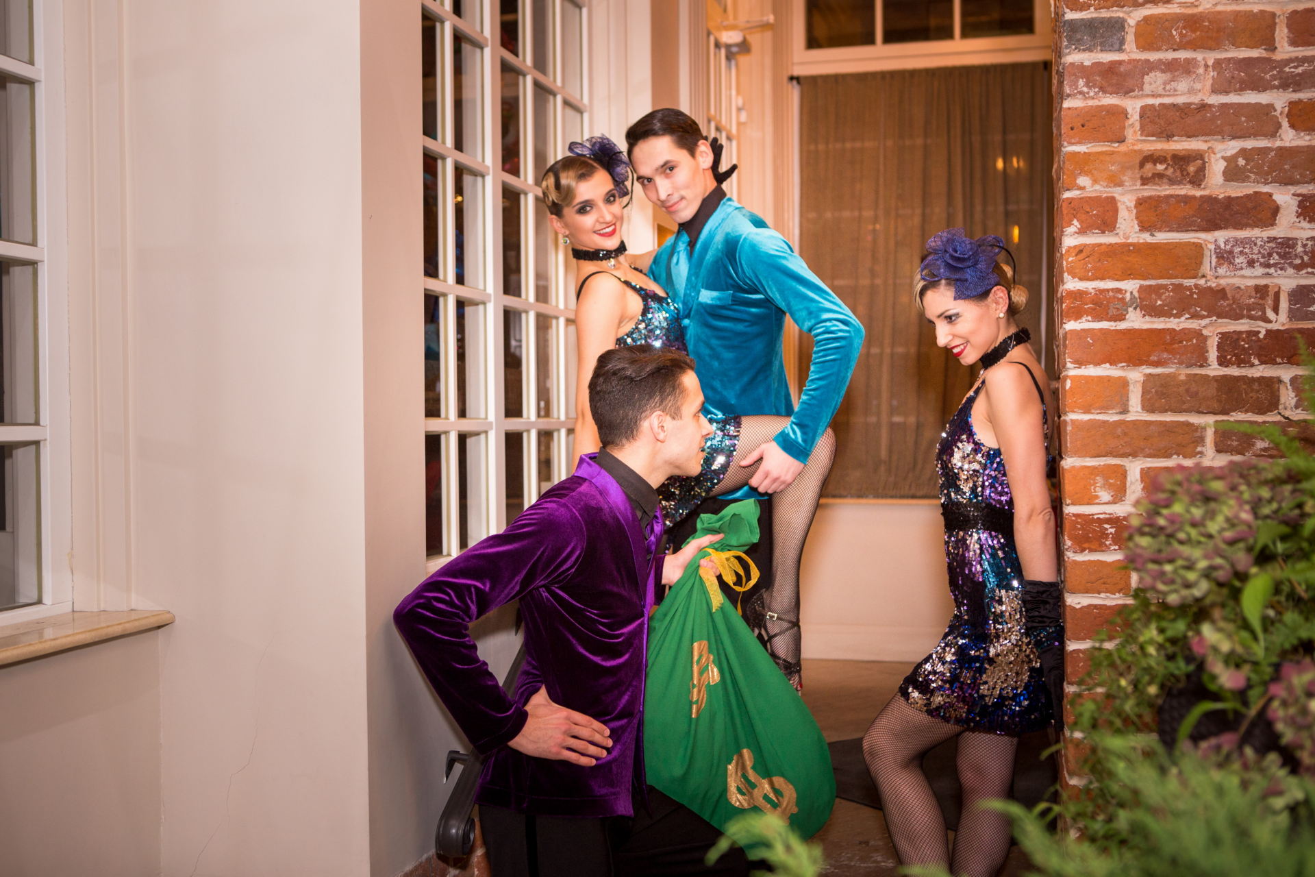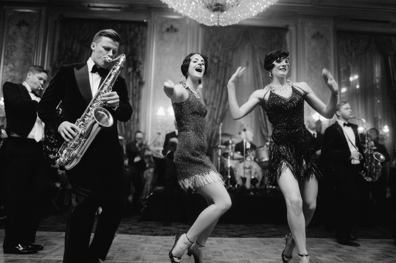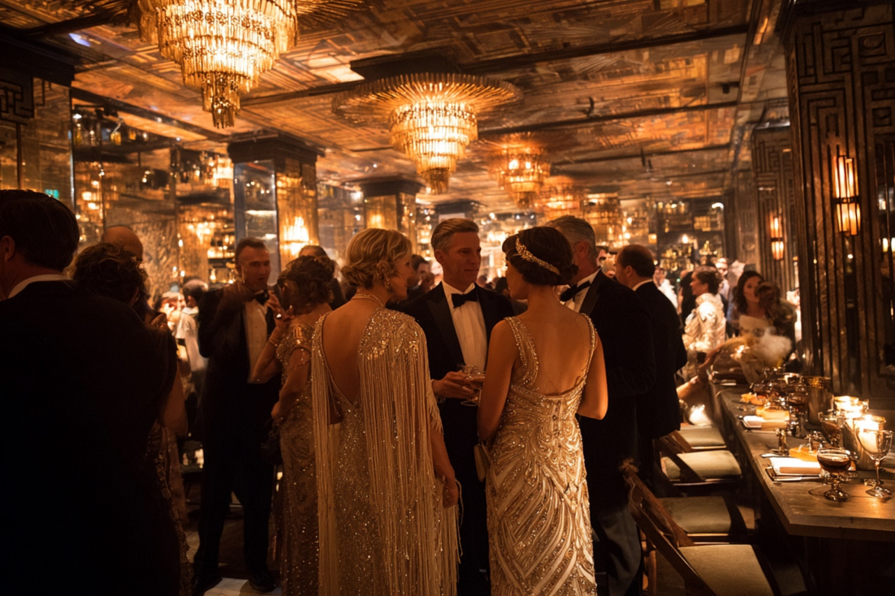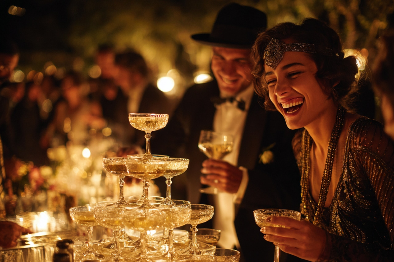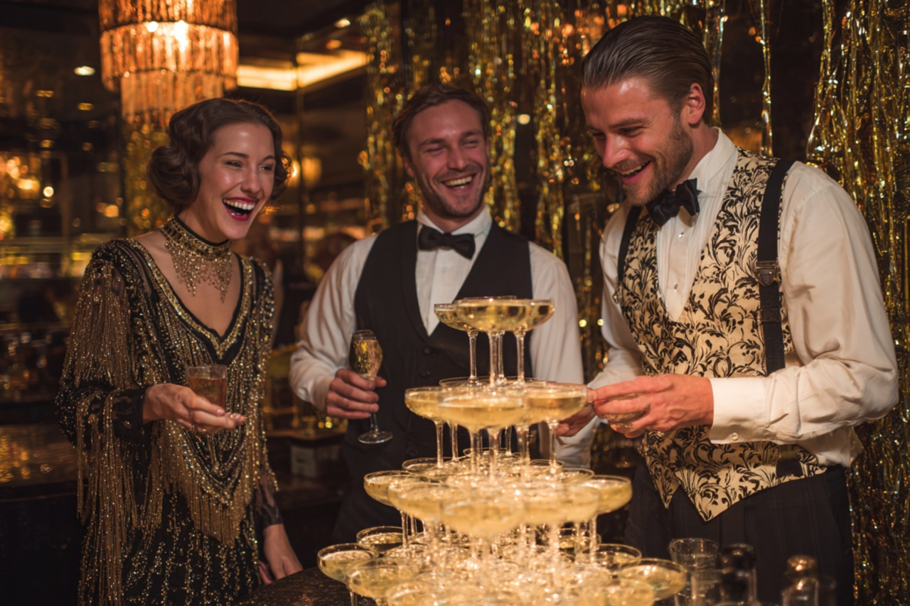 Гостей встречают артисты в вечерних костюмах, звучит джаз и чарльстон, а фуршет сопровождает подача шампанского в башне из бокалов. В программе — живая музыка, шоу-балет, акробаты в блестящих костюмах, фотозоны в декорациях особняка Гэтсби, тематические интерактивы и гангстерская рулетка. Атмосфера становится кинематографичной, будто сцена из фильма, где каждый кадр — роскошь и движение.