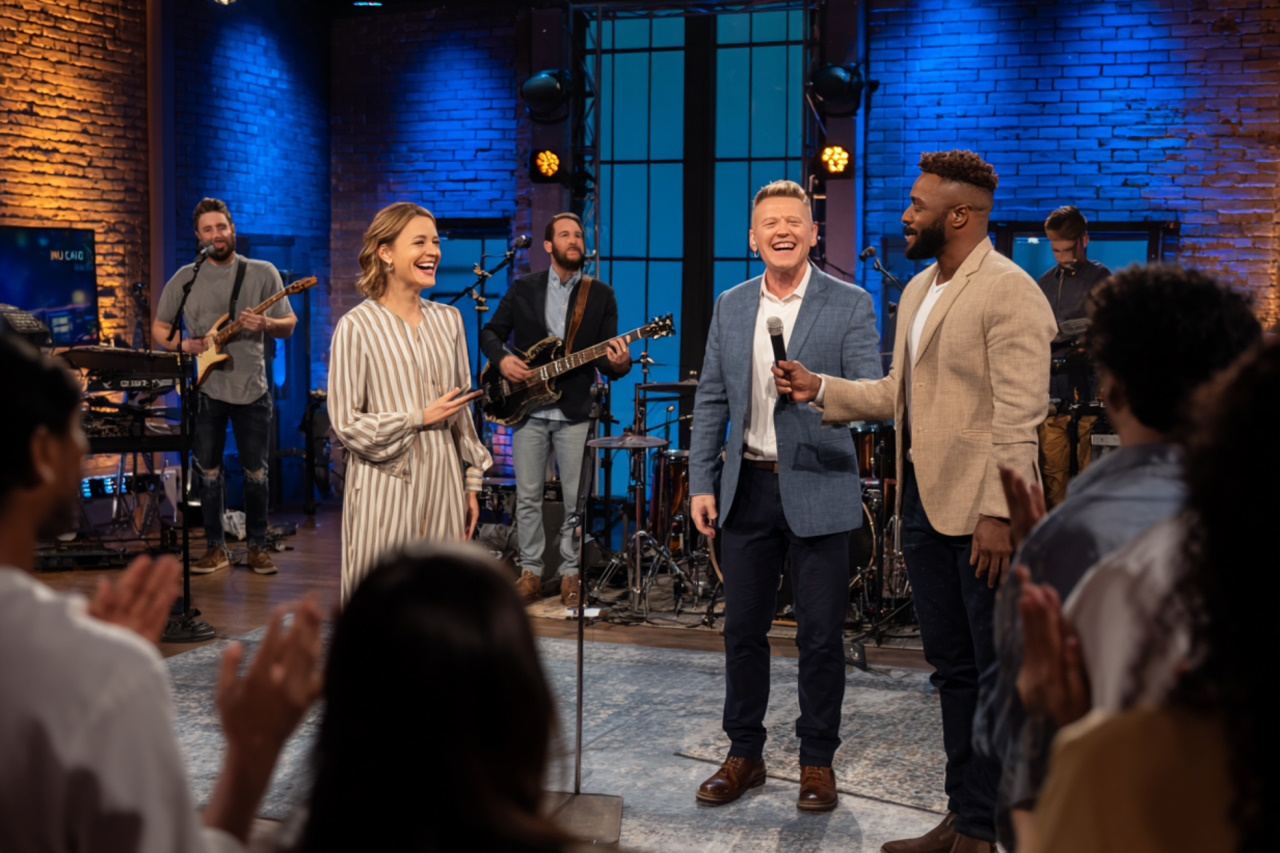 Всё как на настоящем телешоу: яркая студия, свет софитов, живой бэнд и остроумный ведущий. Гости занимают места в зале, камеры включаются — и начинается ваш собственный «Вечерний Ургант». Ведущий с харизмой и чувством юмора берёт интервью у сотрудников, обыгрывает корпоративные инсайды, импровизирует и создаёт ту самую лёгкую атмосферу телешоу, где всё может случиться.